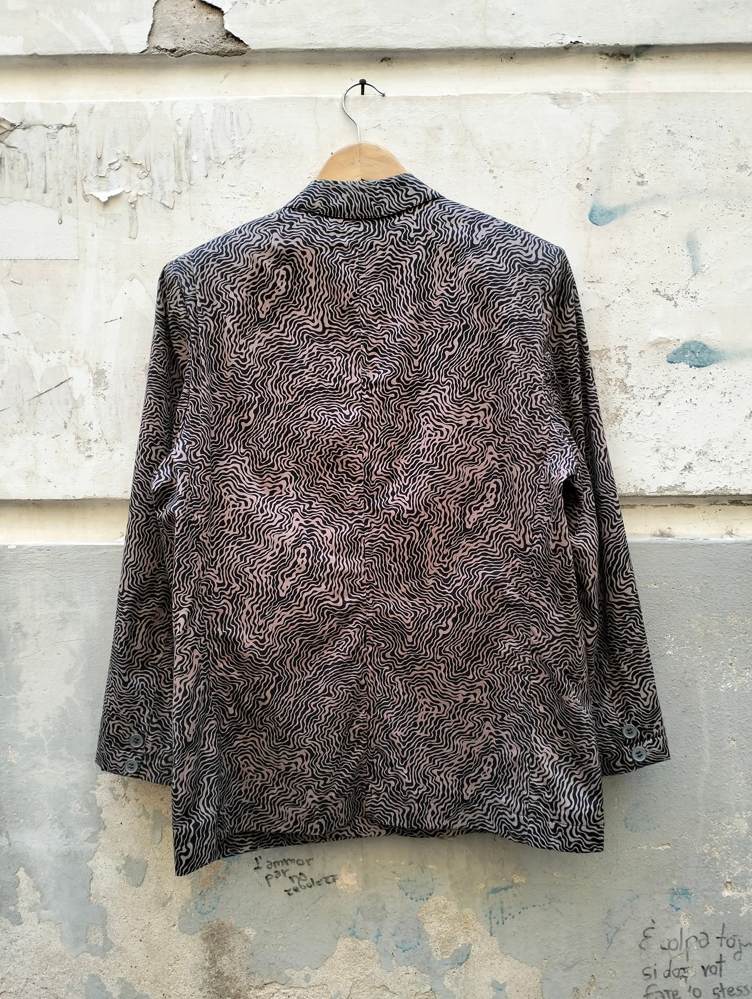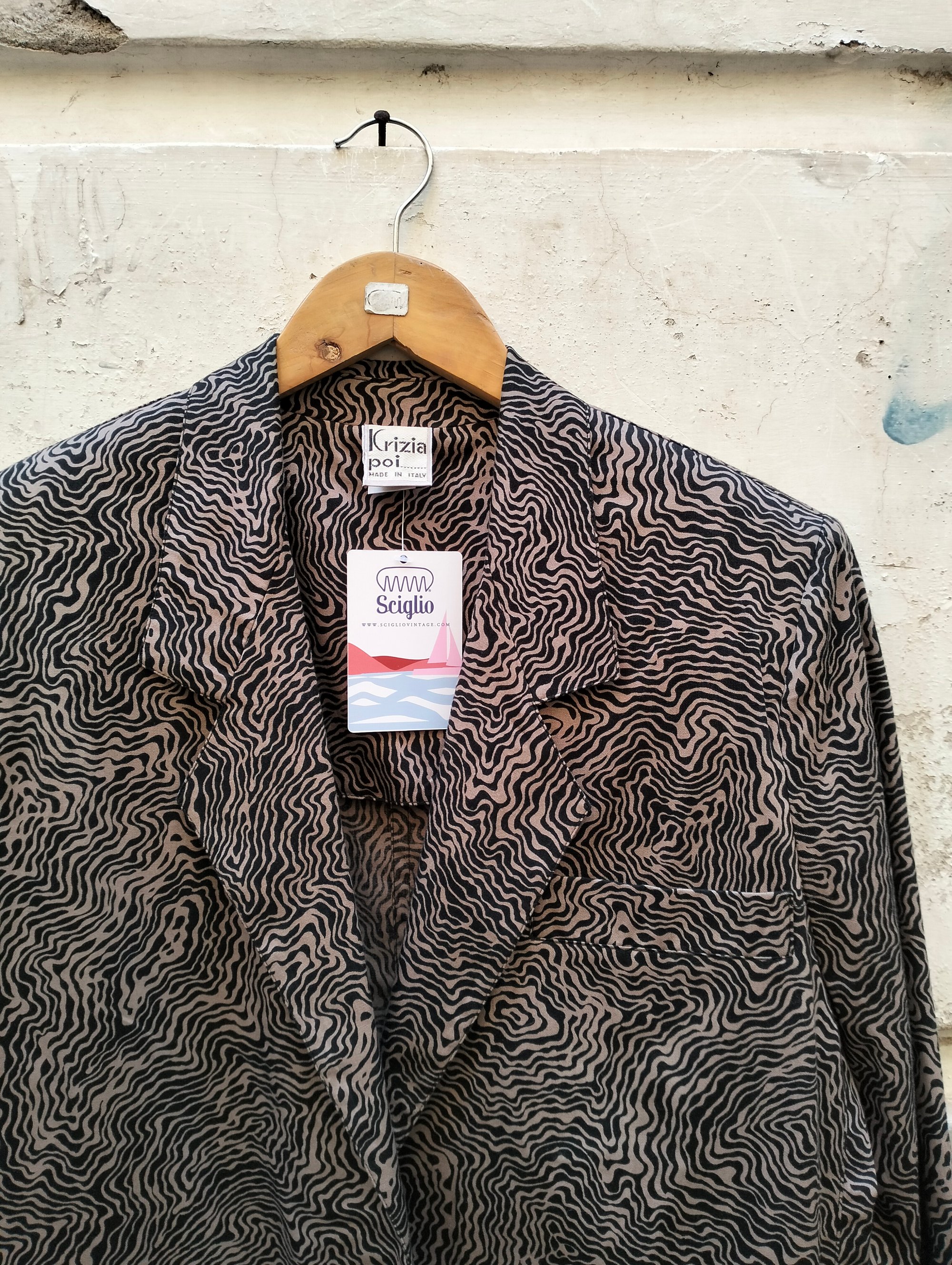 Blazer Krizia Poi, taschino sul petto e doppie tasche in basso. Fantasia super particolare ad ondine concentriche, colore beige e nero, made in Italy, 100% cotone