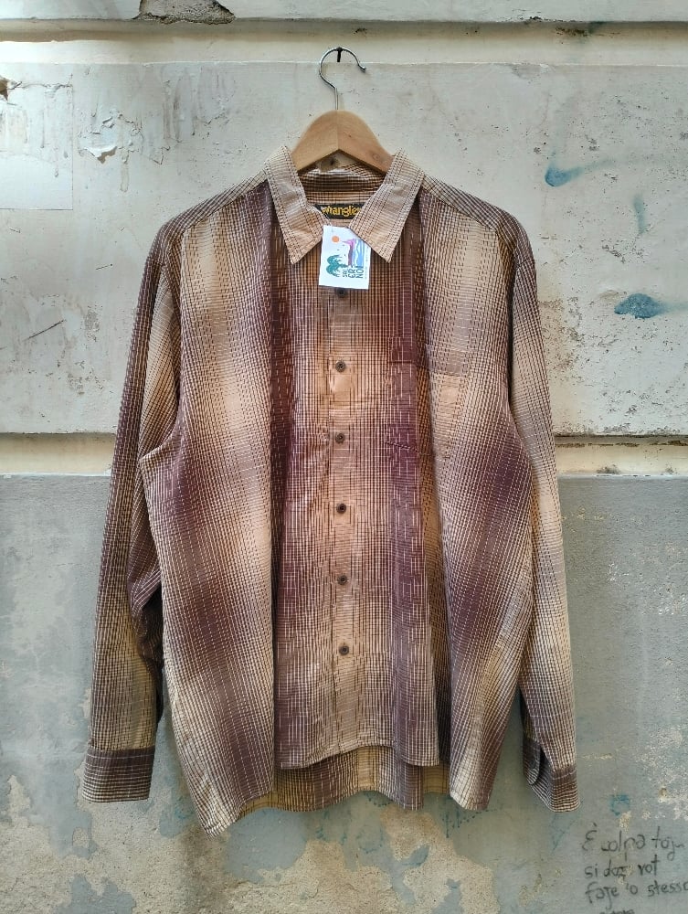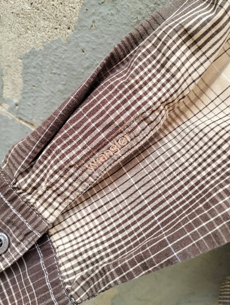 Camicia Wrangler, fantasia quadretti che creano un gioco visivo optical. Colore beige e sfumature di marrone caffè, taschino sul petto, logo ricamato sulla manica all'altezza del polsino e sul petto. Taglia indicata XL, tessuto 100% cotone.