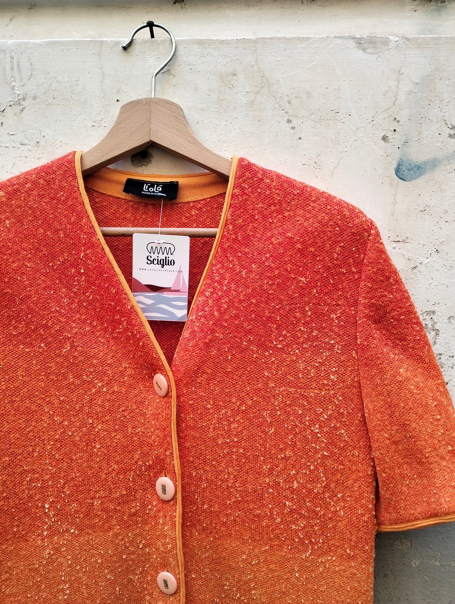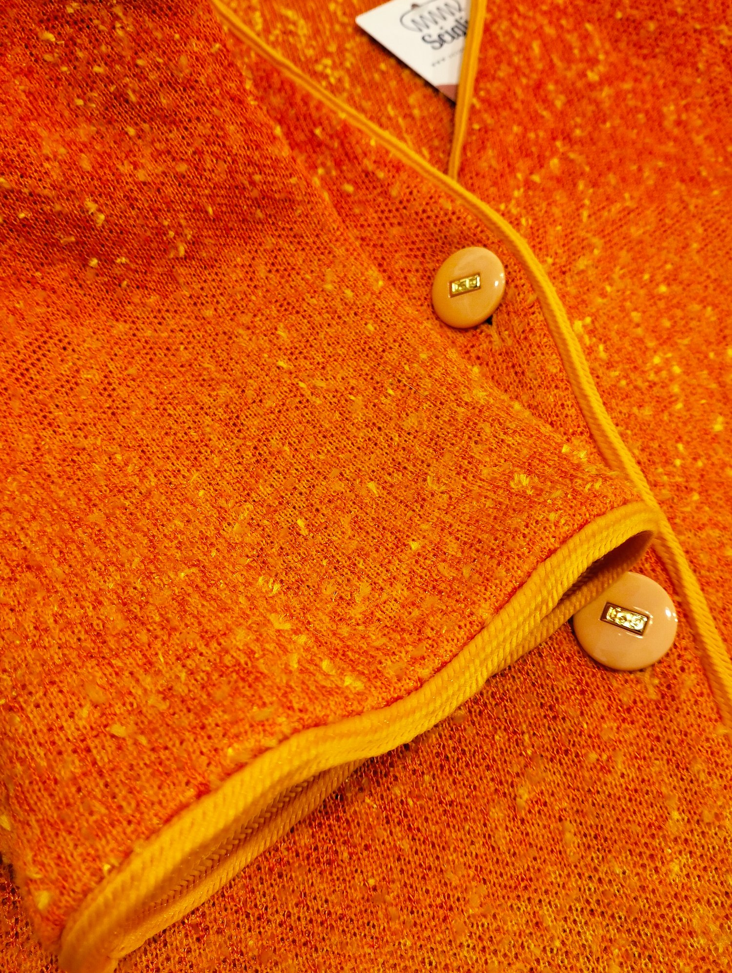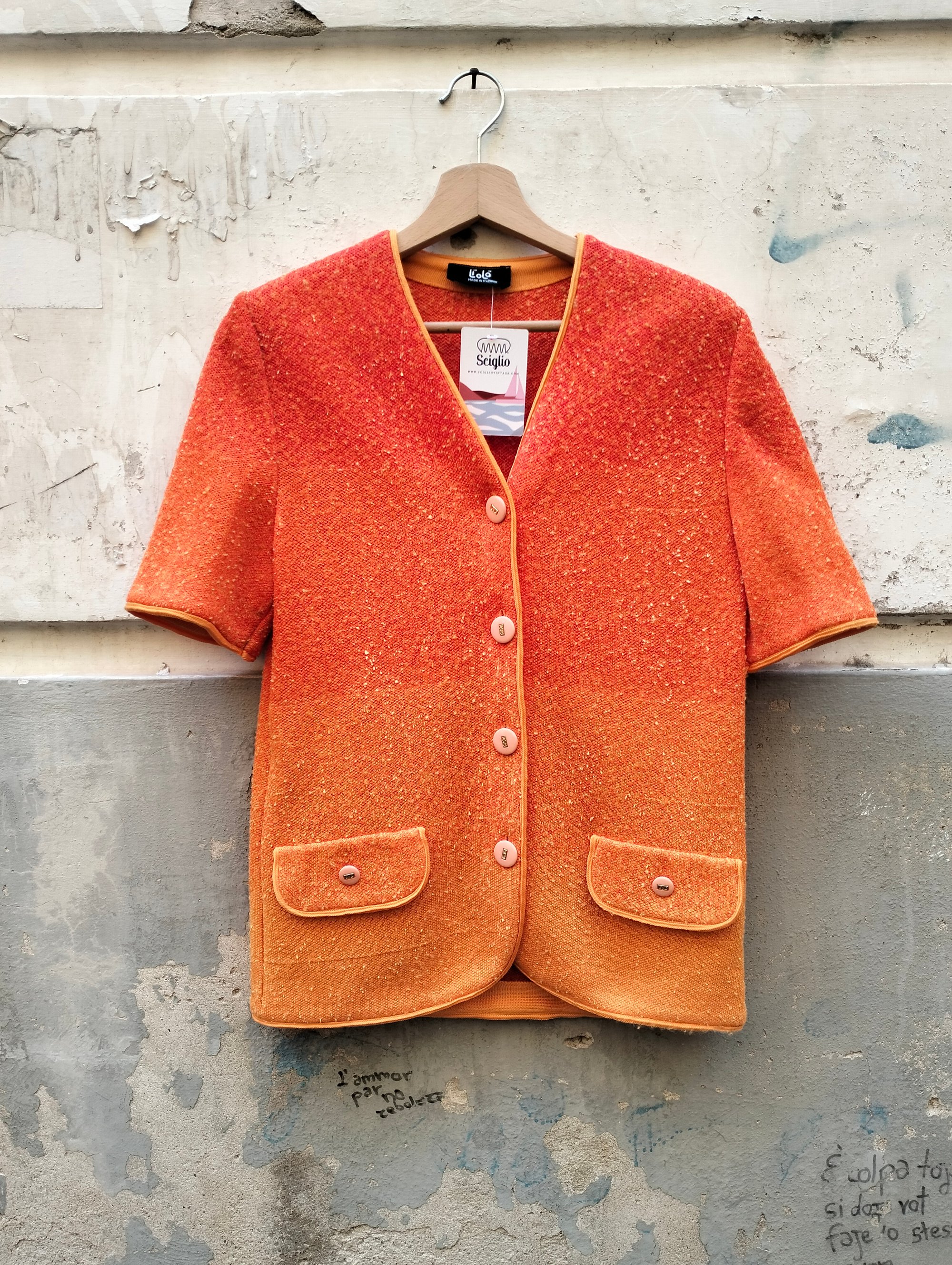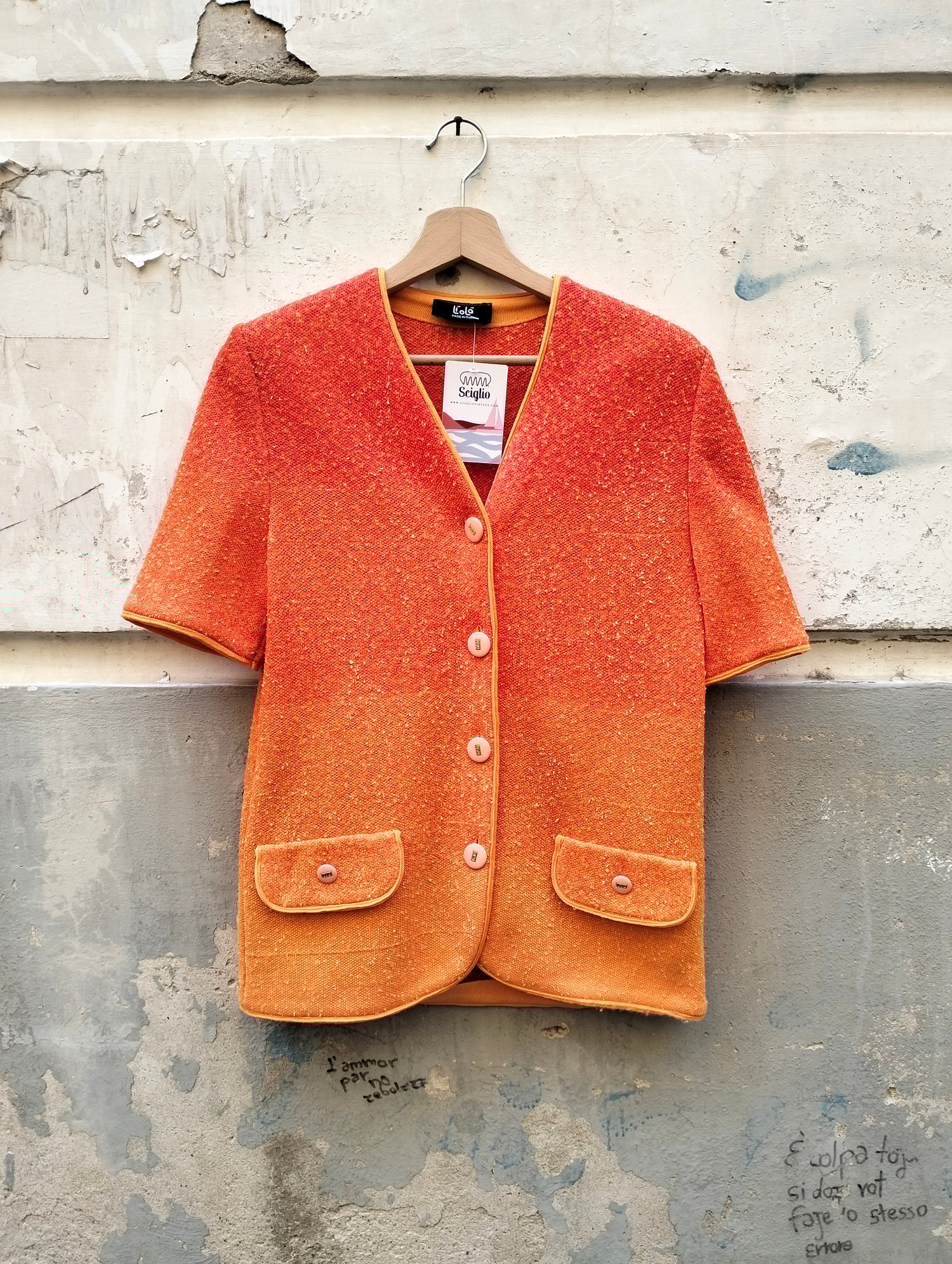 Bellissimo giacchino Liolà, colore arancio che sfuma nel giallo. Tessuto bouclé, lavorato, purtroppo in foto non rendw benissimo. Profili in fettuccia arancione, doppio taschino finito, bottoni logati, made in Italy, spalline.