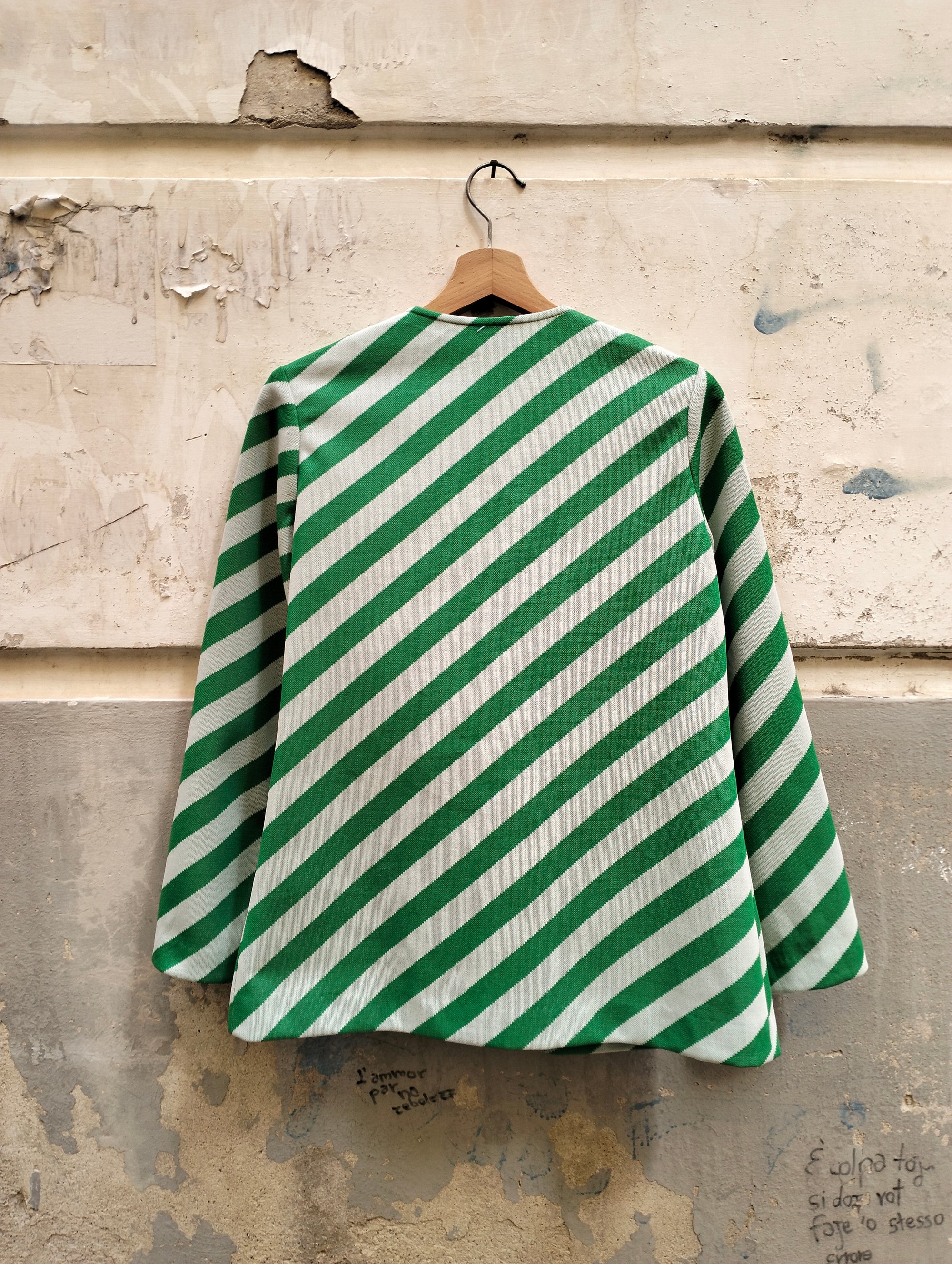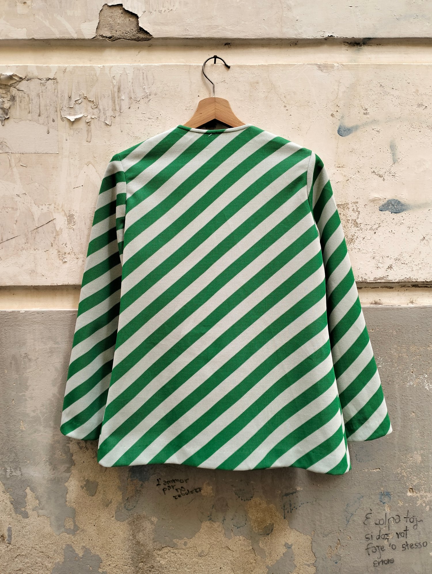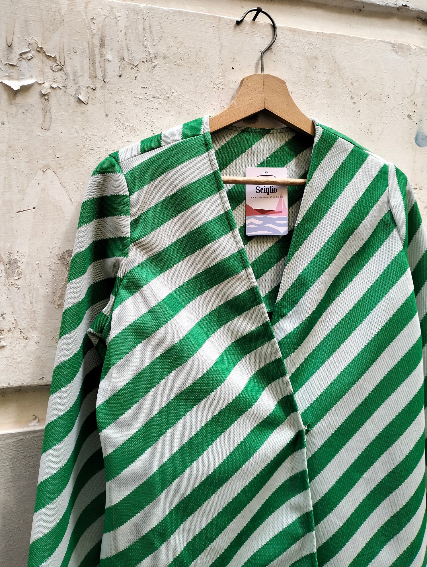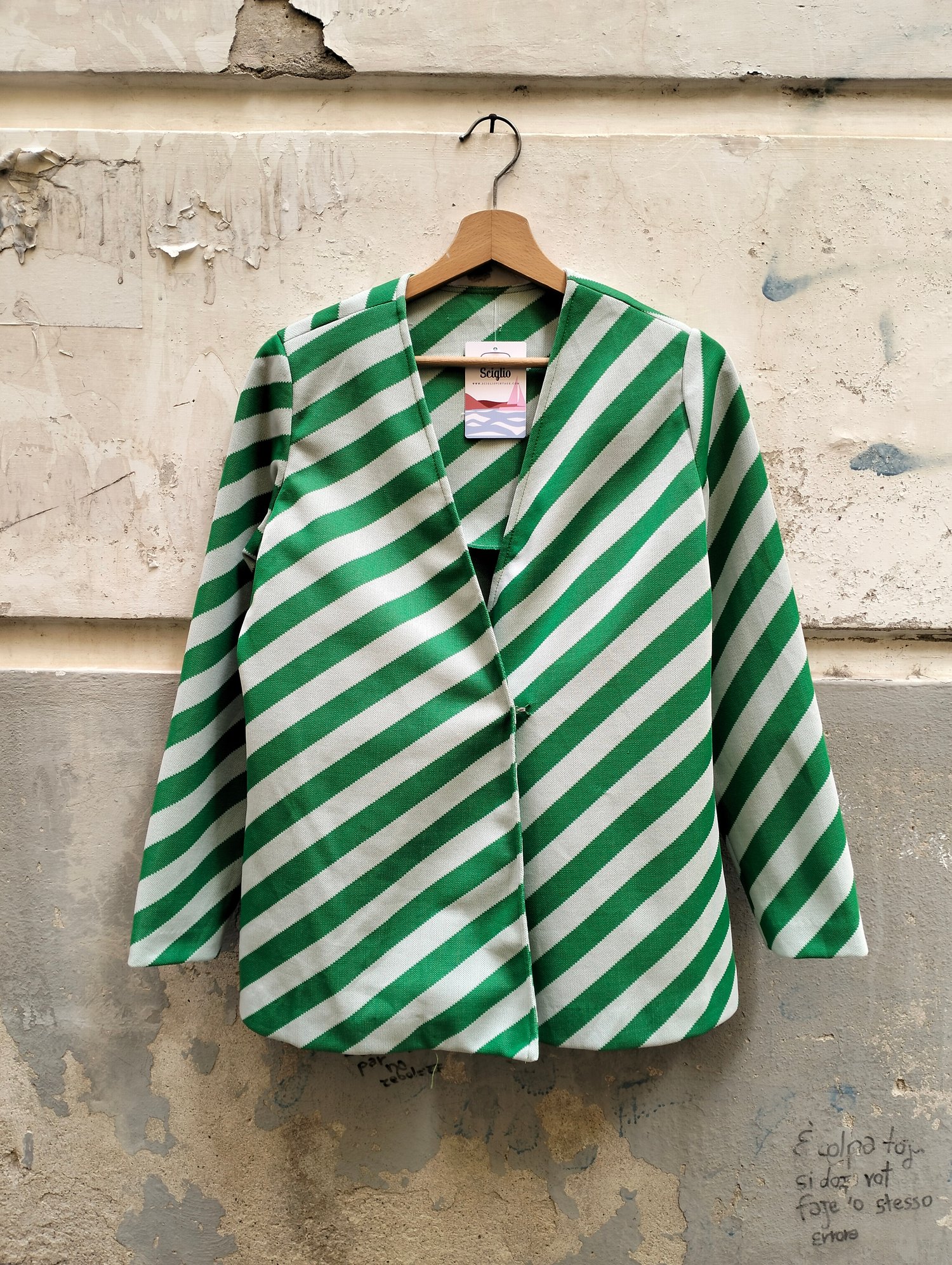 Giacchino sartoriale a righe oblique verdi e bianche. Chiusura con bottoncino e ciappetta. È fatta a mano, per cui non ha etichette di taglia e composizione tessuto, di seguito le misure.