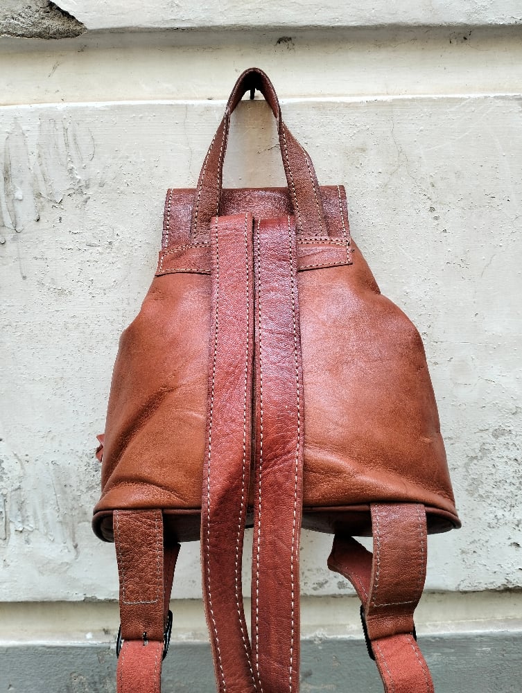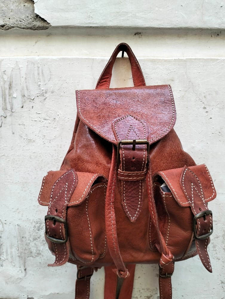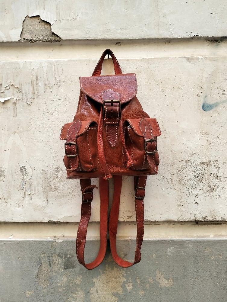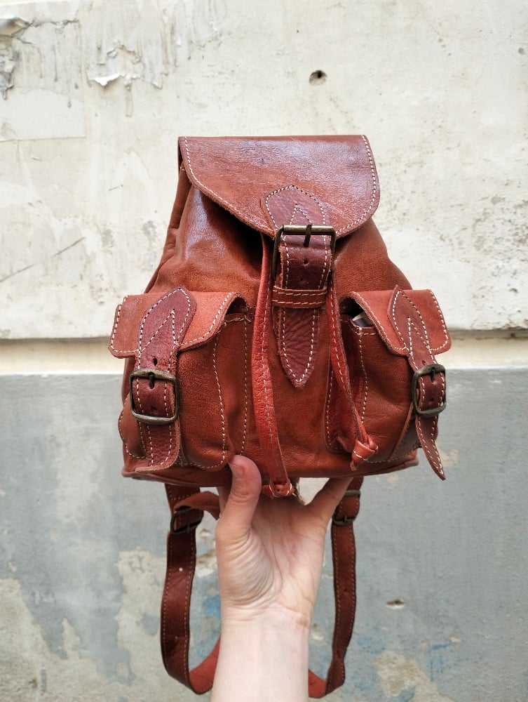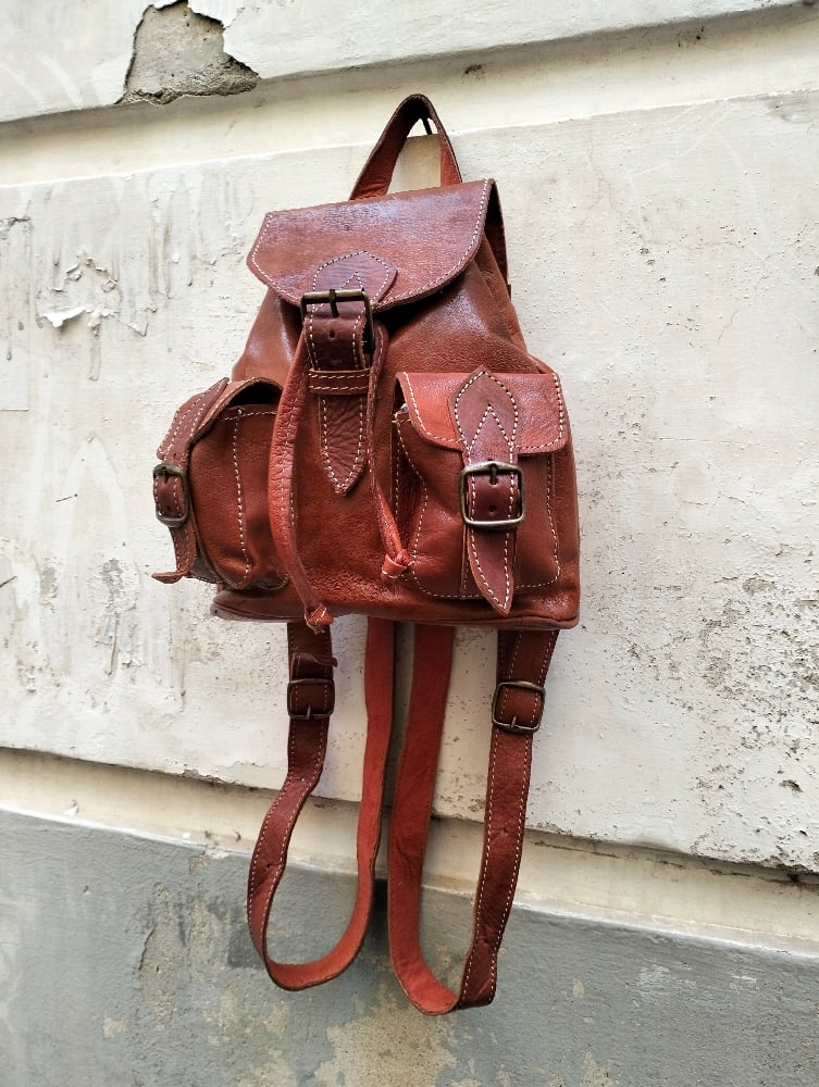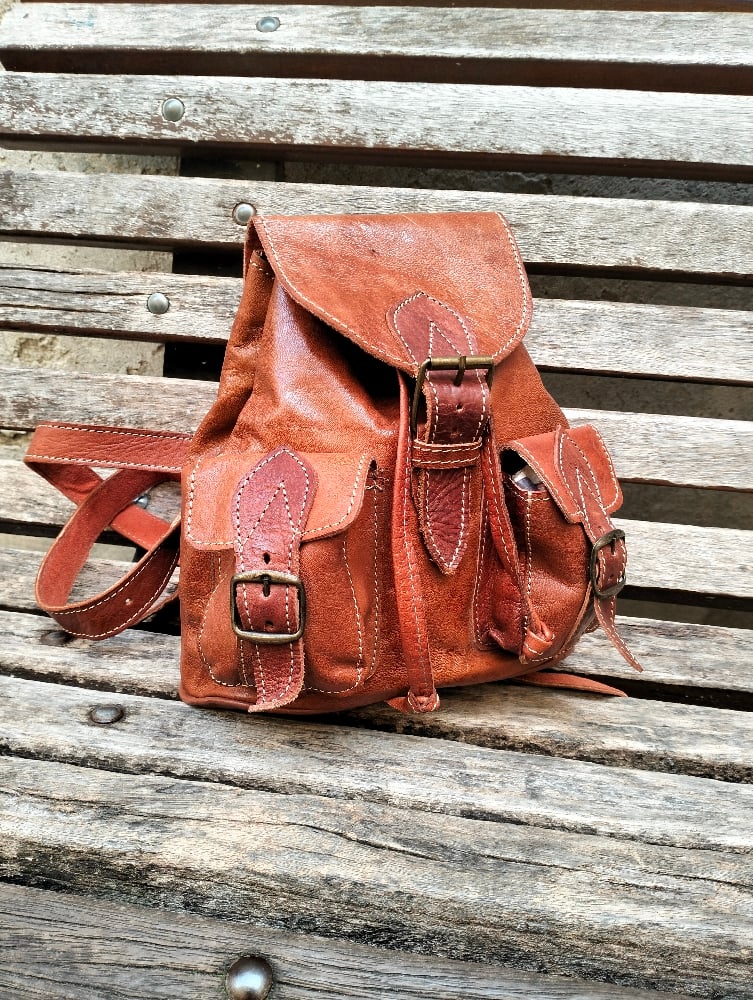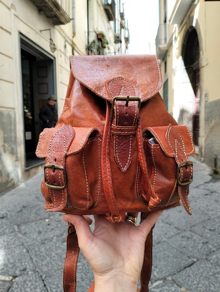 Zainetto in cuoio. Bretelle regolabili, doppi taschini sul davanti. L'interno è rivestito in stoffa ed ha un taschino con cerniera. Super capiente ma allo stesso tempo compatto e leggero.